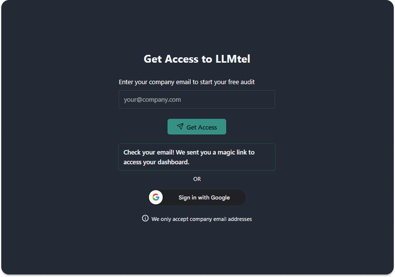 Getting started is easy. Just enter your company email address to receive a magic login link, no passwords required. You’ll get immediate access to your secure dashboard, where you can run audits and review reports.