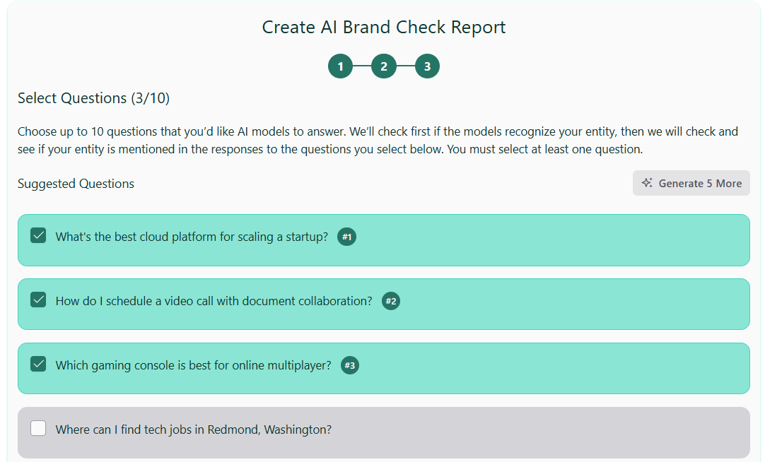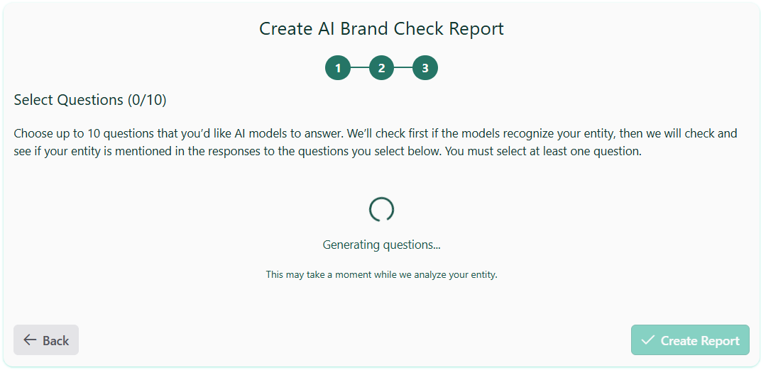 The second section is the Questions overview. For each selected question, see the AI results and how often your entity appeared in the answers.