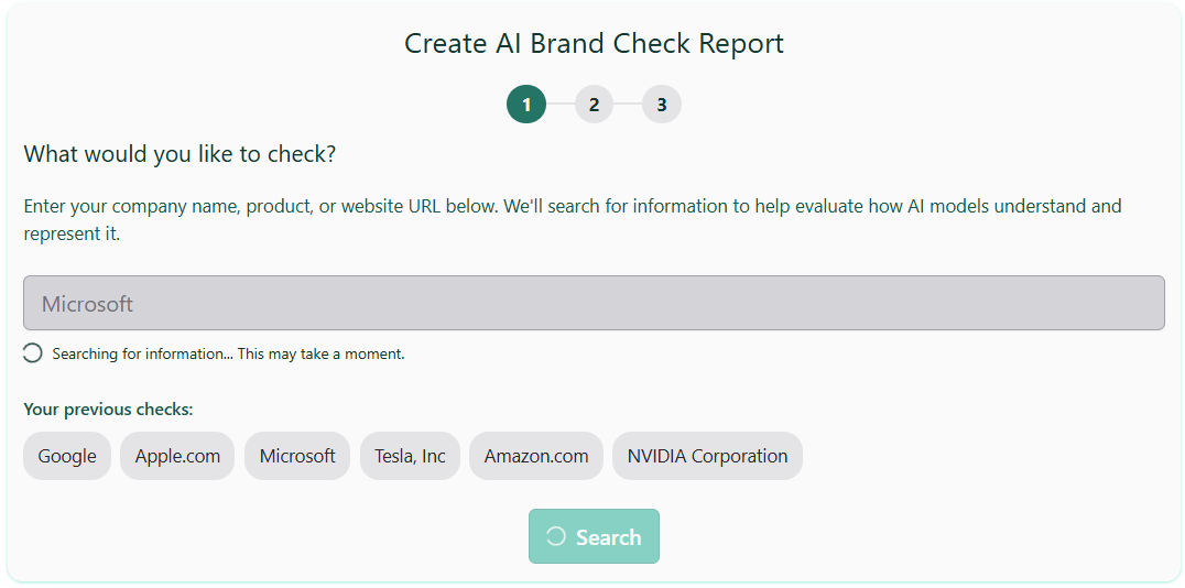Click Search and LLMtel gathers public information about your entity and produces a concise summary.